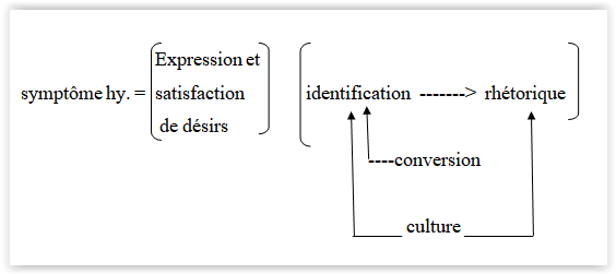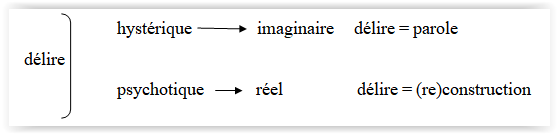 5  - Le scintillement des signifiants de la psychose n'est pas sans attrait pour l'hystérique qui peut y trouver identité, et entendeur. L'hystérique se structure dans l'articulation de son désir avec l'institution psychiatrique, un des modes d'expression en est la symptomatologie d'apparence psychotique.