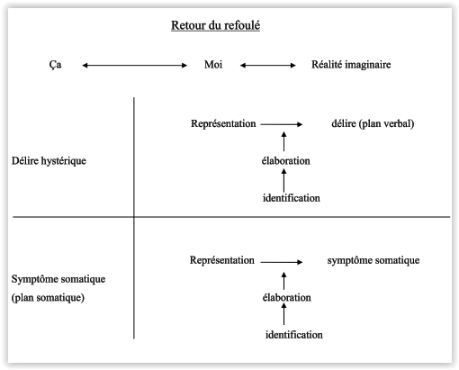5  - Le scintillement des signifiants de la psychose n'est pas sans attrait pour l'hystérique qui peut y trouver identité, et entendeur. L'hystérique se structure dans l'articulation de son désir avec l'institution psychiatrique, un des modes d'expression en est la symptomatologie d'apparence psychotique.